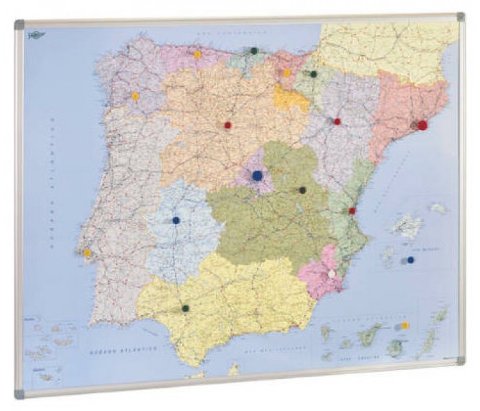 Mapa de España y Portugal. Superficie plastificada y fondo metálico, permite la utilización de imanes. Con marco de aluminio y cantoneras de protección. Suministrados con elementos de fijación. Medidas: 103 × 129 cm.