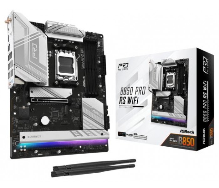 Asrock B850 Pro RS WiFi. Fabricante de procesador: AMD, Socket de procesador: Zócalo AM5, Procesador compatible: AMD Ryzen 7000 Series, AMD Ryzen 8000 Series, AMD Ryzen 9000 Series. tipos de memoria compatibles: DDR5-SDRAM, Memoria interna máxima: 256 GB, Tipo de ranuras de memoria: DIMM. Interfaces de disco de almacenamiento soportados: M.2, SATA III, Niveles RAID: 0, 1, 10. Tipo de interfaz ethernet: 2.5 Gigabit Ethernet, Controlador LAN: Dragon RTL8125BG, Estándar Wi-Fi: Wi-Fi 6E (802.11ax). Componente para: PC, Factor de forma: ATX, Familia del chipset: AMD