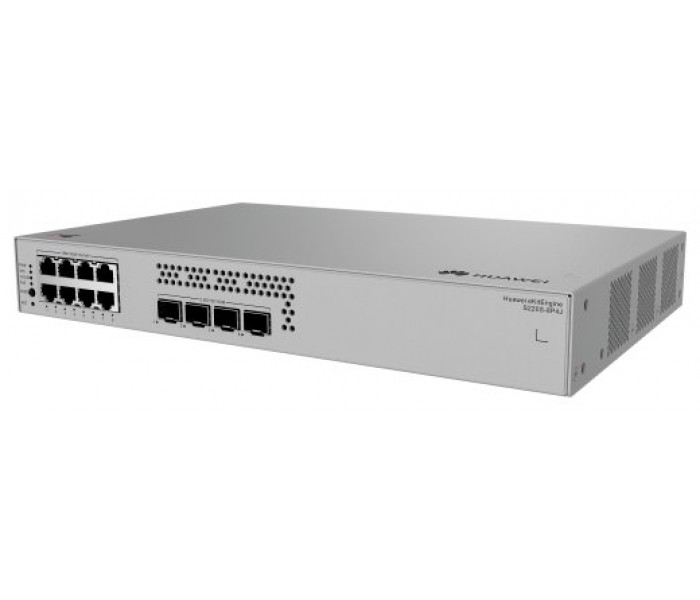 HUAWEI eKit S220S Series S220S-8P4J. Tipo de interruptor: Gestionado, Capa del interruptor: L2. Puertos tipo básico de conmutación RJ-45 Ethernet: Gigabit Ethernet (10/100/1000), Cantidad de puertos básicos de conmutación RJ-45 Ethernet: 8. Tabla de direcciones MAC: 16000 entradas, Capacidad de conmutación: 36 Gbit/s. Estándares de red: IEEE 802.1D, IEEE 802.1s, IEEE 802.1w. Conector eléctrico: Conector de alimentación AC-in. Energía sobre Ethernet (PoE). Montaje en rack, Factor de forma: 1U