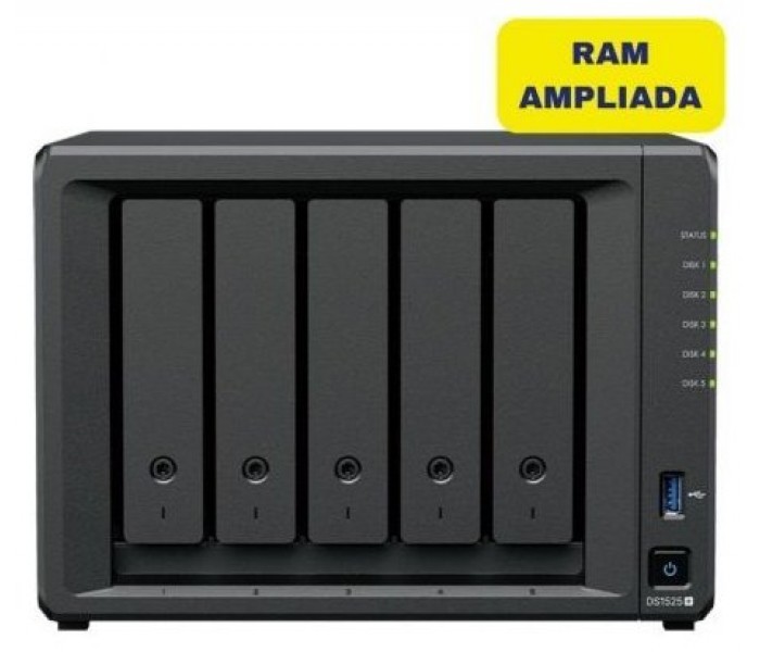 El DS1525+ cuenta con conectividad 2.5GbE integrada con opción de 10GbE y es compatible con SSDs SATA y HDDs en bahías internas de 2.5"/3.5", así como con unidades M.2 NVMe a través de ranuras M.2 para su uso como caché
