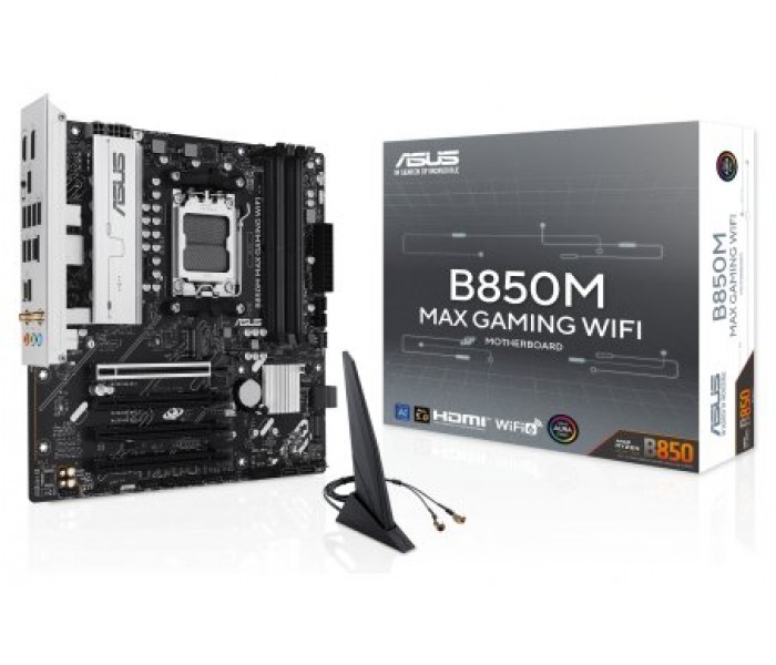 ASUS B850M MAX GAMING WIFI. Fabricante de procesador: AMD, Socket de procesador: Zócalo AM5, Procesador compatible: AMD Ryzen 7000 Series, AMD Ryzen 8000 Series, AMD Ryzen 9000 Series. tipos de memoria compatibles: DDR5-SDRAM, Memoria interna máxima: 256 GB, Tipo de ranuras de memoria: DIMM. Interfaces de disco de almacenamiento soportados: M.2, SATA III, Tipos de unidades de almacenamiento admitidas: HDD & SSD, Niveles RAID: 0, 1, 5, 10. Tipo de interfaz ethernet: Gigabit Ethernet, Estándar Wi-Fi: Wi-Fi 6 (802.11ax), Wi-Fi estándares: Wi-Fi 6 (802.11ax). Componente para: PC, Factor de forma: micro ATX, Familia del chipset: AMD