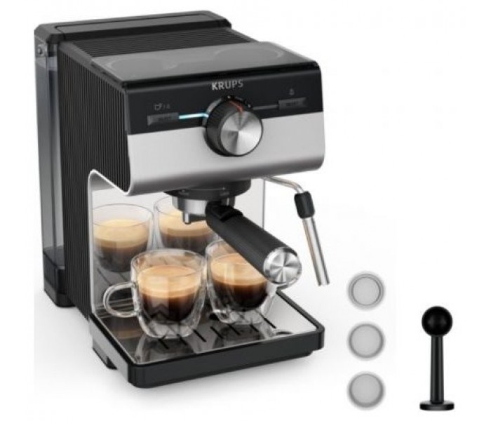 Disfruta de una cafetera espresso renovada hasta el último detalle, con grandes patas de goma para mayor estabilidad y espacio de almacenamiento inteligente para los filtros.