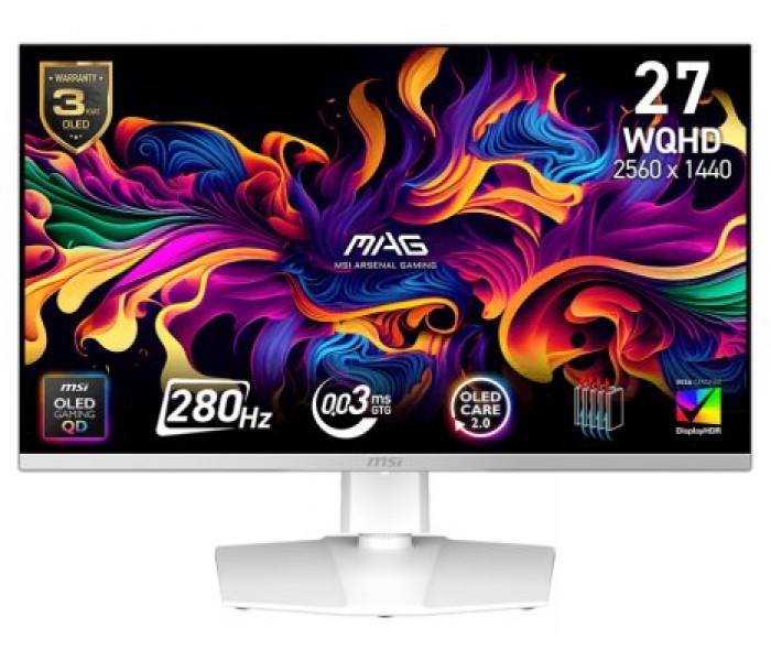 MSI MAG 272QPW QD-OLED X28. Diagonal de la pantalla: 67,3 cm (26.5"), Resolución de la pantalla: 2560 x 1440 Pixeles, Tipo HD: Wide Quad HD, Tecnología de visualización: QD-OLED, Tiempo de respuesta: 0,031 ms, Relación de aspecto nativa: 16:9, Ángulo de visión, horizontal: 178°, Ángulo de visión, vertical: 178°. montaje VESA, Ajustes de altura. Color del producto: Blanco