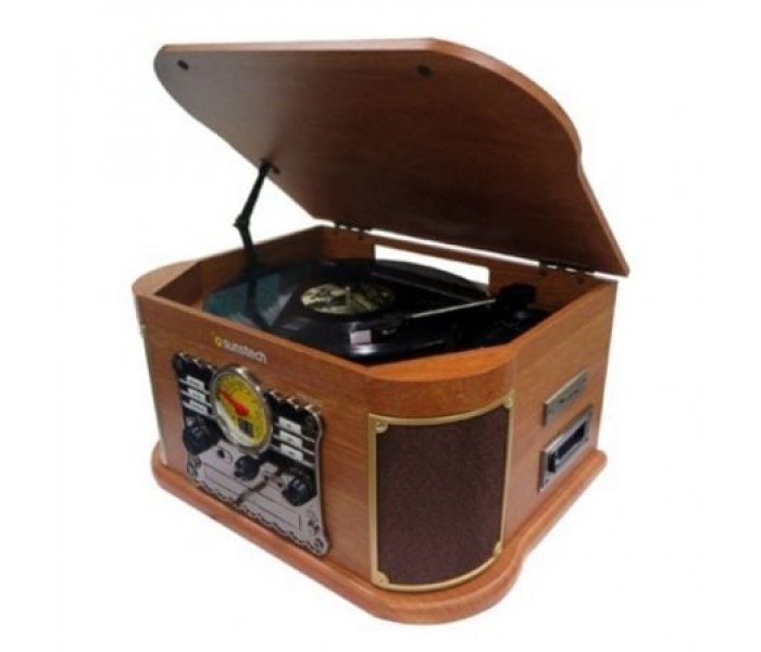Tocadiscos de madera con Bluetooth, reproductor de CD, pletina para cassette, radio y función encoding que convierte los archivos analógicos en archivos MP3 sin necesitar ordenador por USB y TF.
