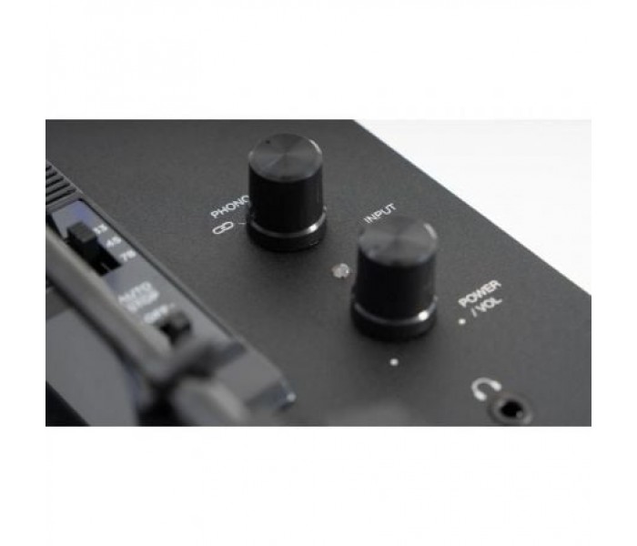madera mdf recubierta de pvc negro y tela. incorpora cápsula y aguja cerámica.
