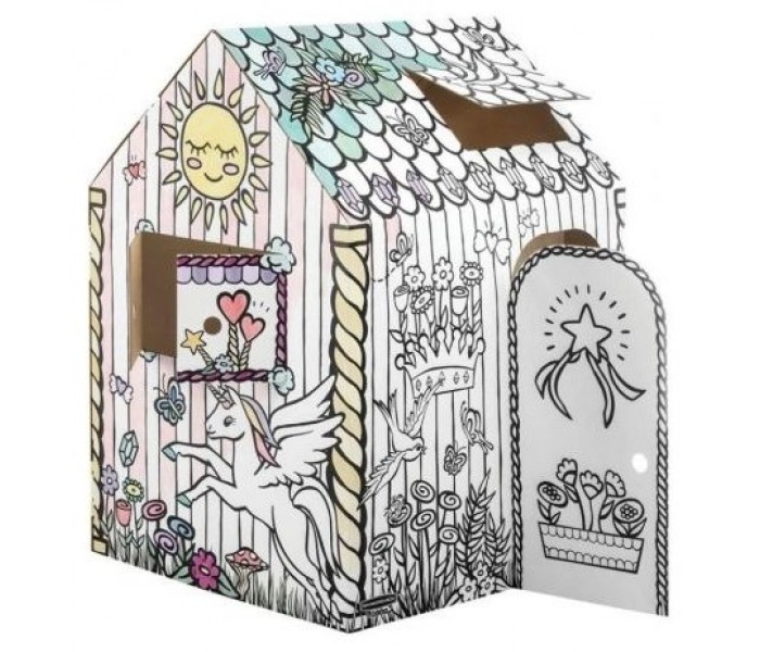 Casita de juegos realizada en resistente cartón ondulado con motivo de unicornio, lista para colorear, fácil montaje en dos piezas, puertas y ventanas que se abren e impresa con tintas al agua sobre cartón certificado FSC.