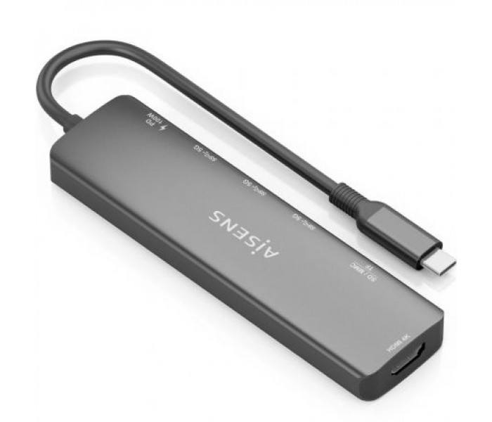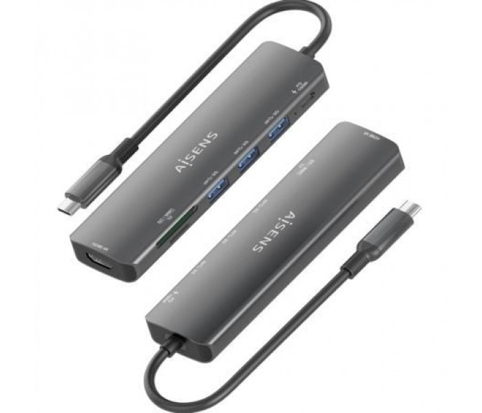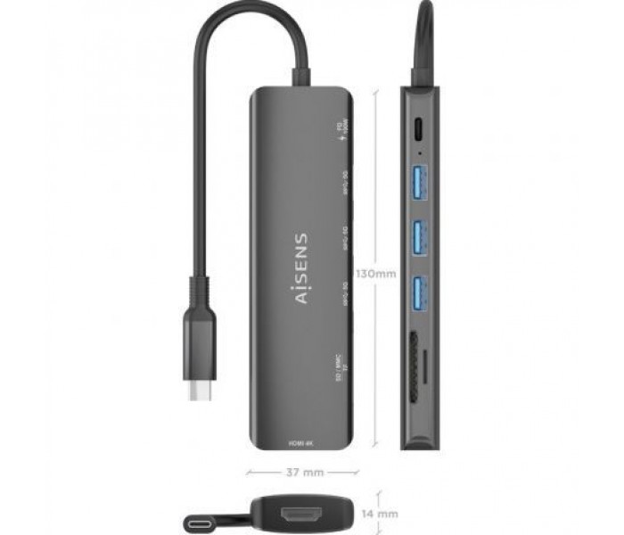 AISENS - USB-C DOCK 7 EN 1, USB-C A 1xHDMI, 3xUSB-A, 1xUSB-C PD 100W, 1xSD, 1xMICRO SD, GRIS, 15CM