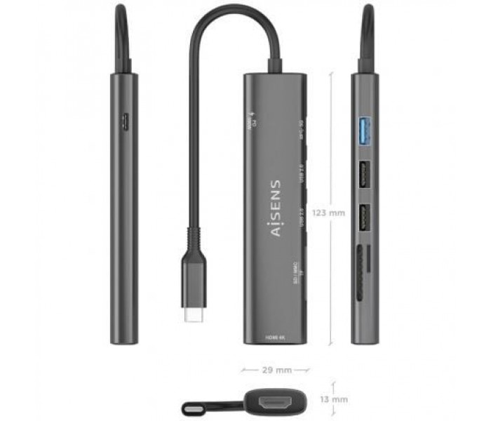 AISENS - USB-C DOCK 7 EN 1, USB-C A 1xHDMI, 2xUSB-A USB2.0, 1xUSB-A USB3.0, 1xUSB-C PD 100W, 1xSD, 1xMICRO SD, GRIS, 15CM