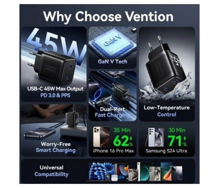 - Salida (USB-C1/C2): 5V⎓3A; 9V⎓3A; 12V⎓3A; 15V⎓3A; 20V⎓2,25A (45W máx.)