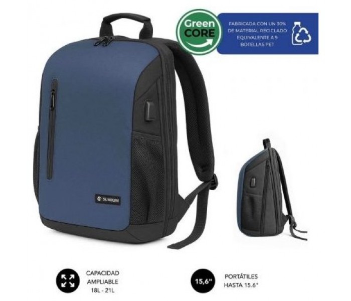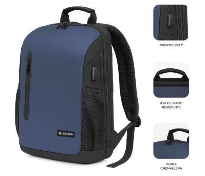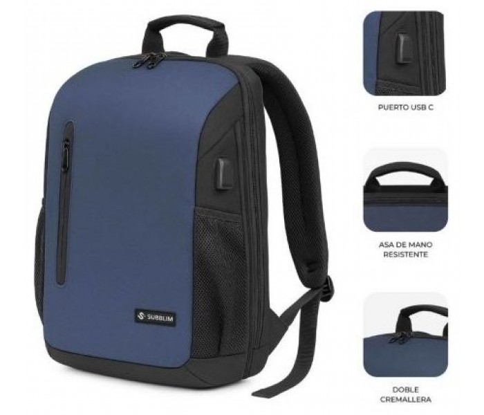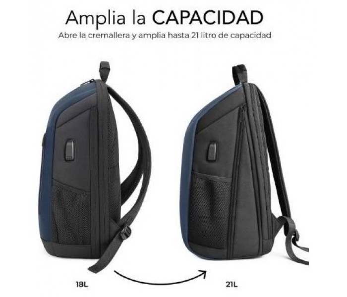 Bolsillo frontal de acceso rápido Panel interior para cargadores, bolígrafos y ratón Bolsillos laterales elásticos para botellas Puerto USB-C externo para cargar tu móvil en movimiento (requiere power bank)
